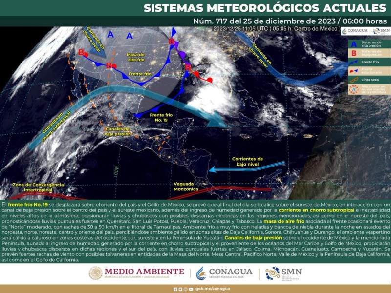 Oaxaca de Juárez, Oax. 25 de diciembre de 2023.- La Coordinación Estatal de Protección Civil y Gestión de Riesgos (CEPCyGR) informa que el frente frío número 19 se desplazará durante este lunes sobre el oriente de la República Mexicana y por la tarde-noche alcanzará el sureste.