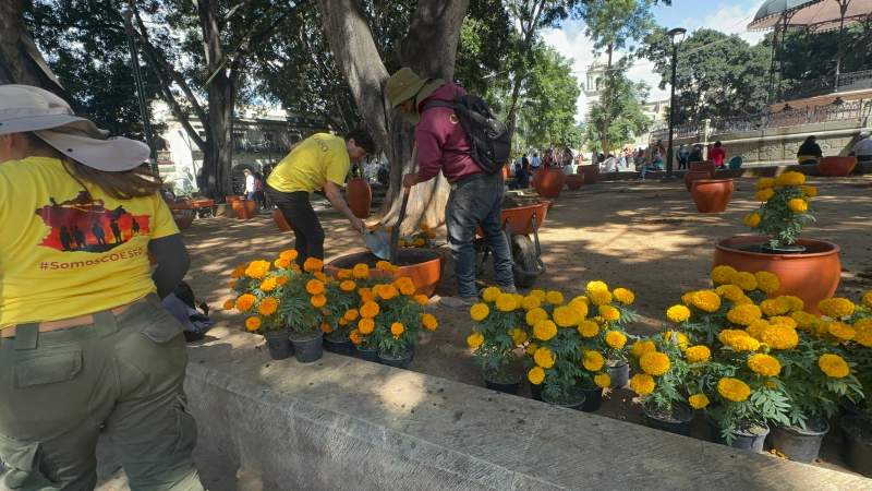 La Comisión Estatal Forestal (COESFO) ha iniciado la colocación de más de 12 mil macetas de flores de cempasúchil en el zócalo de Oaxaca.