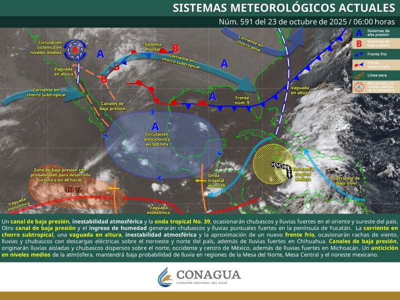 Oaxaca de Juárez, Oax., 23 de octubre de 2025.— La Coordinación Estatal de Protección Civil y Gestión de Riesgos (CEPCyGR) informó que se esperan precipitaciones ligeras a moderadas y tormentas aisladas, con actividad eléctrica y ráfagas de viento, principalmente en el oriente del Istmo de Tehuantepec, Cuenca del Papaloapan, Sierra de Juárez y Sierra Sur.