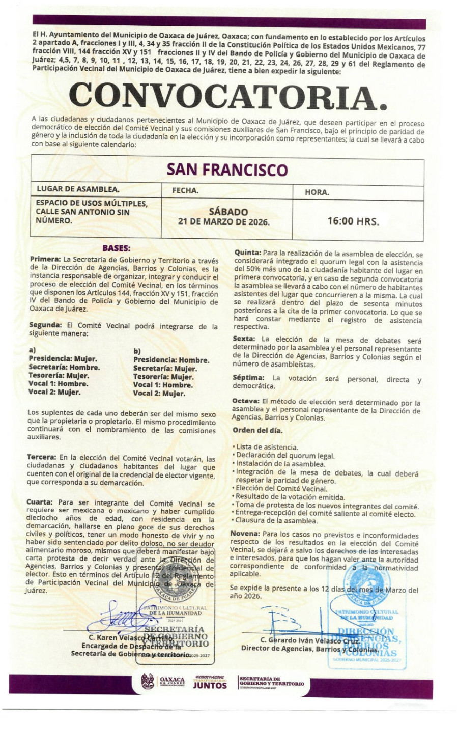 Con el propósito de fortalecer la organización comunitaria y promover la participación activa de la ciudadanía, la Secretaría de Gobierno y Territorio del Municipio de Oaxaca de Juárez, a través de la Dirección de Barrios y Colonias, emitió nuevas convocatorias para la renovación de Comités Vecinales y sus Comisiones Auxiliares en dos zonas más de la capital.