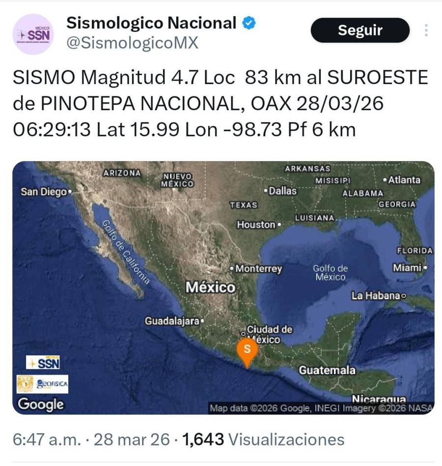 Un sismo magnitud 4.7 se registró este sábado en las Costas de Oaxaca.
