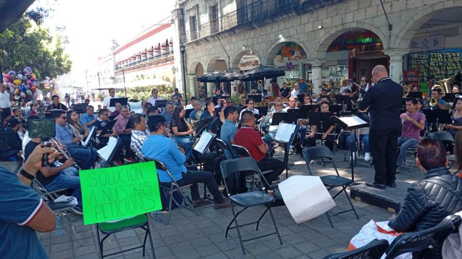 Un grupo de músicos de la Banda del Estado protestaron esta tarde en su concierto en el zócalo capitalino.